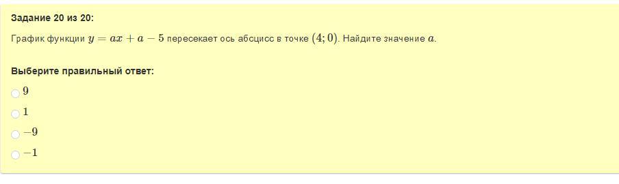 Поскольку точка (4;0) принадлежит прямой y = ax + a - 5, то, подставляя координаты точки в уравнение прямой, мы получим