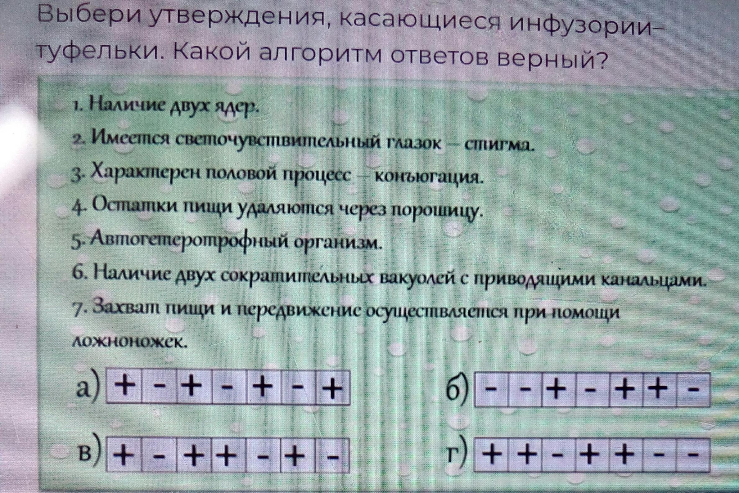 Смотрим путём отброса вариантов. Наличие двух ядер. Это так. Вариант б отпадает. Имеется глазок, нет, это у эвглены зеленой, вариант г нам не подходит, смотрим задание 7. У инфузории нет ложноножек и откидываем вариант а.