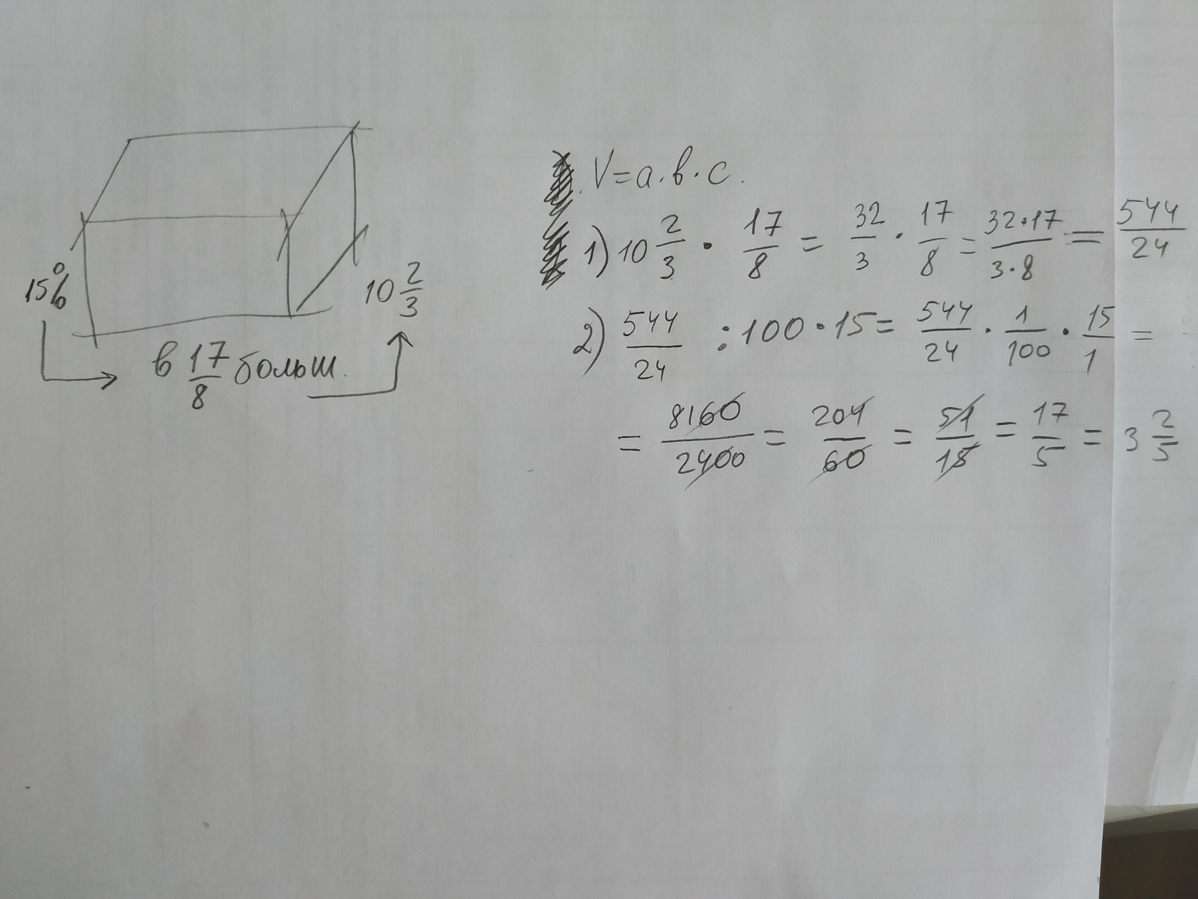 ширина прямоугольного параллелепипеда равна 10 2/3 см, его длина в 1 7/8 раза больше ширины а высота составляет 15% длины. Вычислите обьем параллелепипеда