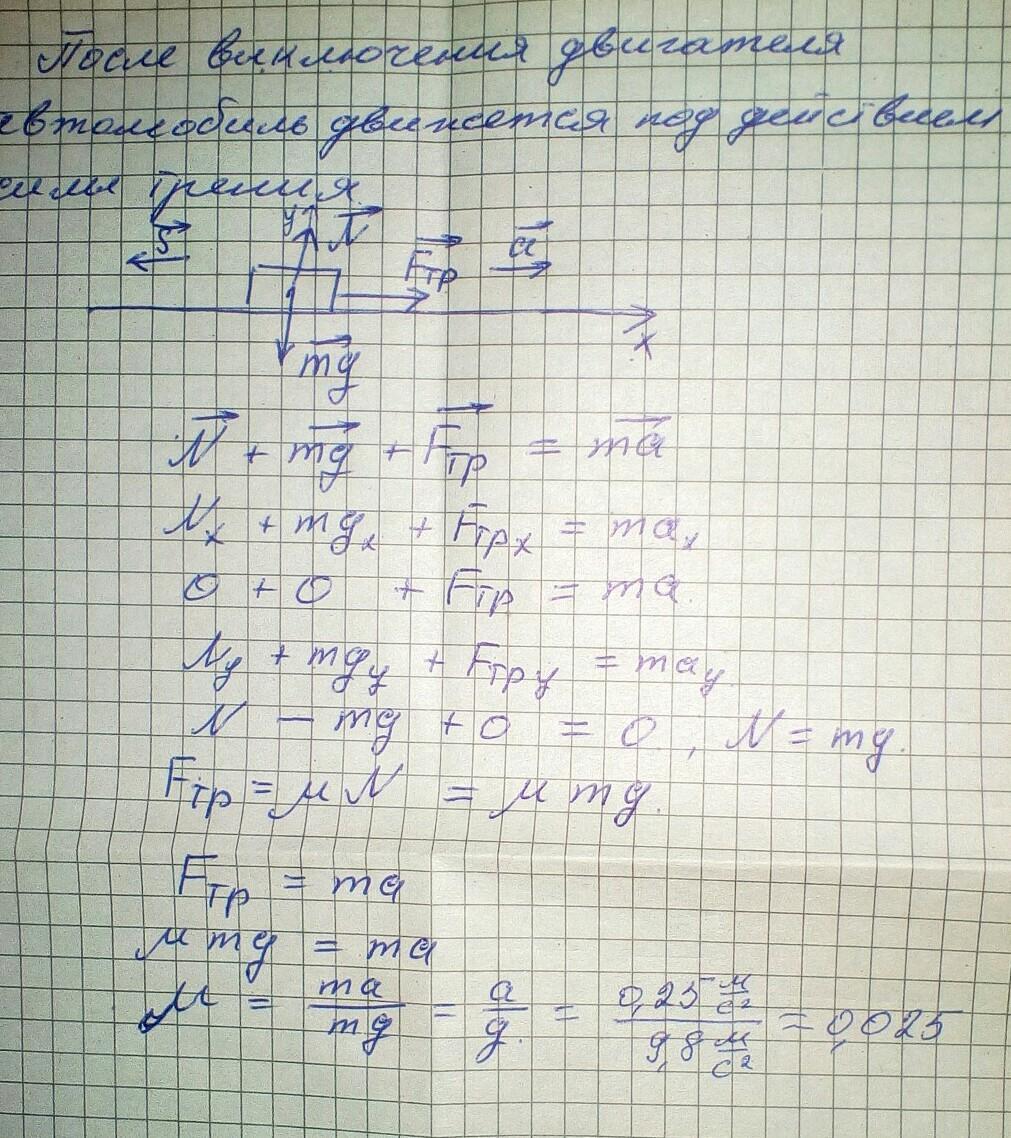 Автомобиль движется по прямой горизонтальной дороге и после выключения двигателя уменьшает свою скорость от 8 до 5 м/с на пути 78 м. Определите коэффициент трения для этого случая.