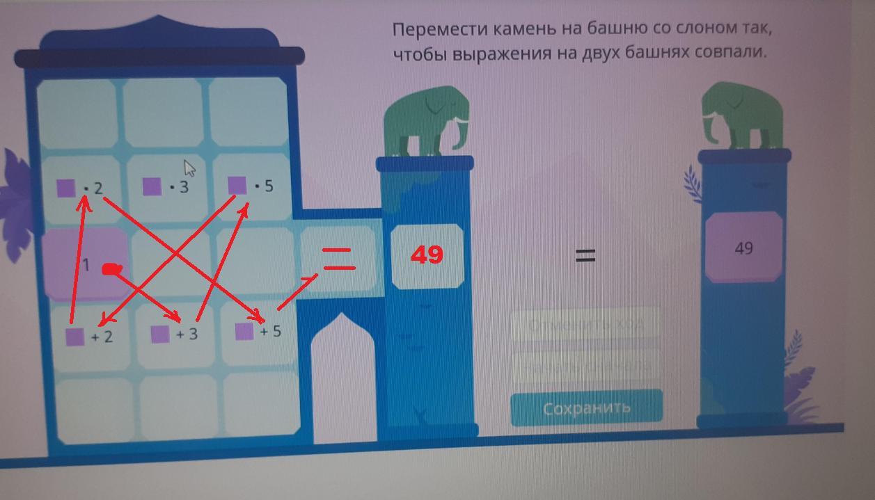 Переместить башню со слоном так, чтобы выражения на двух башнях совпали (чтоб получилось 49).