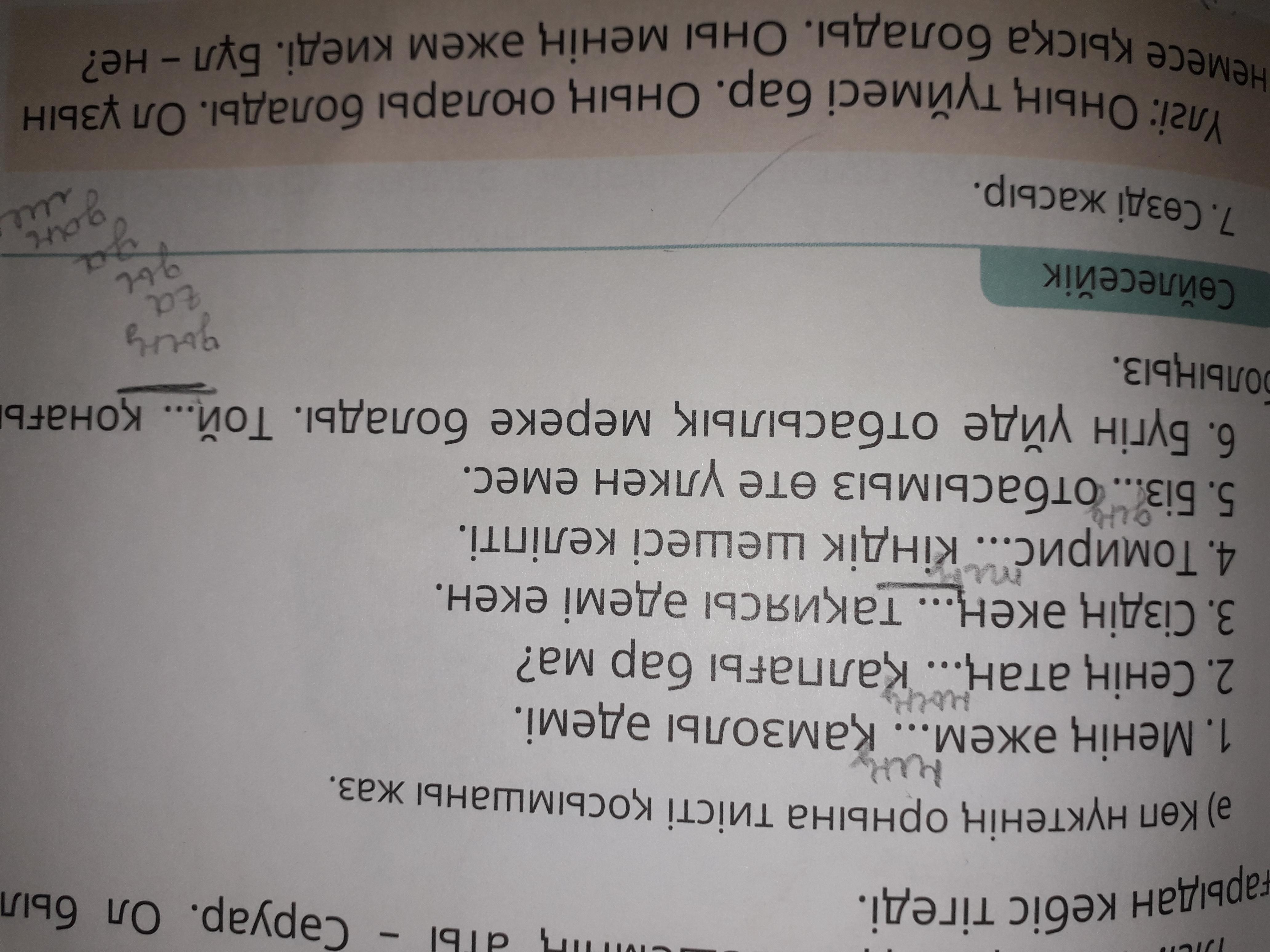 Помогите с упражнением под буквой ә. Мы в основном разобрались, но не можем вставить правильные окончания в 3 и 6 предложении. Они подчеркнуты.