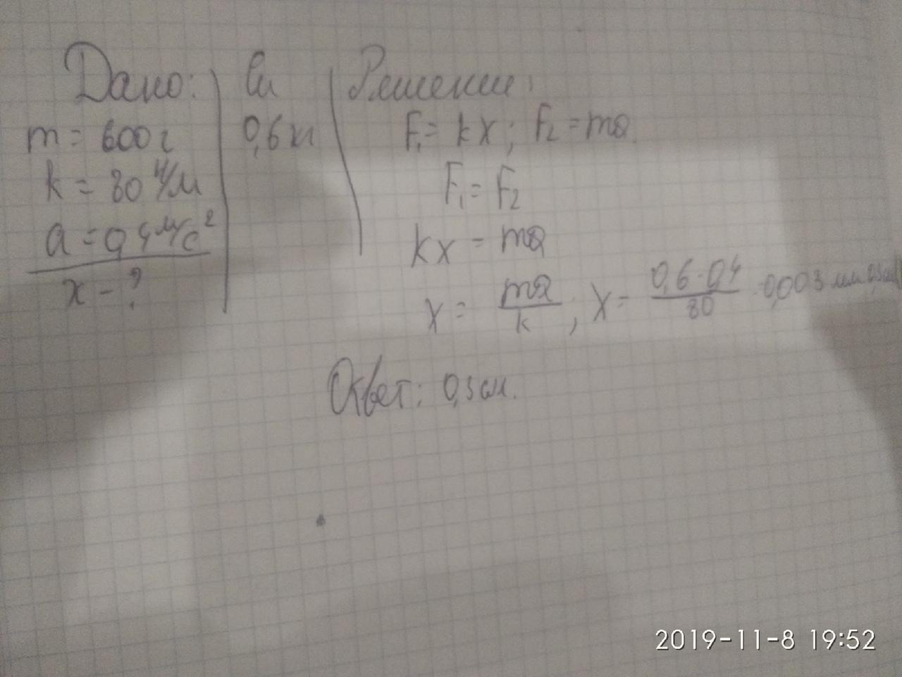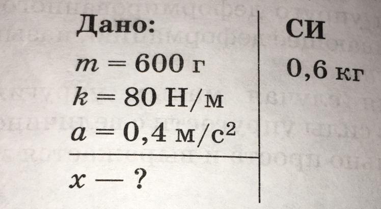 С помощью пружины жёсткостью 80 H/м по гладкой горизонтальной поверхности перемещают металлический кубик массой 600г, прикладывая к нему горизонтальную силу. Определите удлинение пружины, если ускорение кубика 0,4м/с^2. Можно, пожалуйста решение.