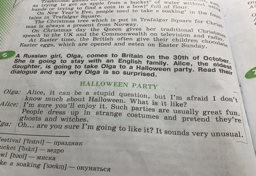 Alice was sure that Olga would enjoy it. She added that such parties were usually great fun. She said that people dressed up in strange costumes and pretended they were ghosts and witches.