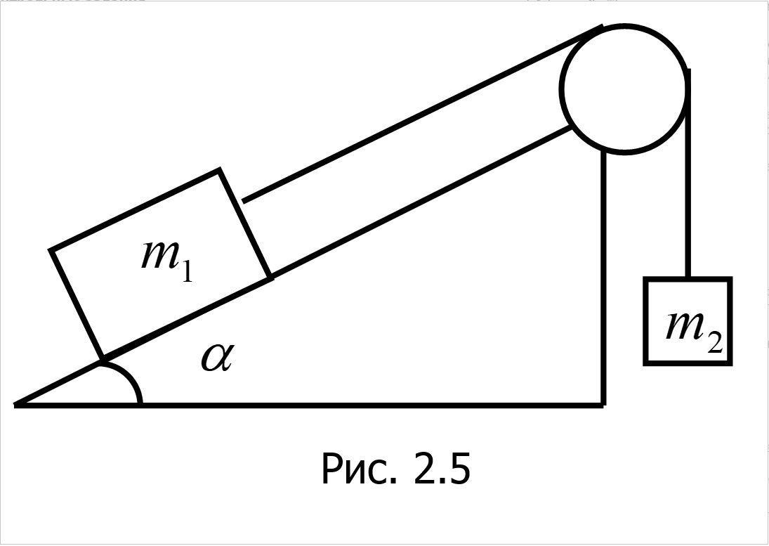 В установке (рис. 2.5) угол наклонной плоскости с горизонтом равен 30°, массы тел =500 г и =200 г. При этом тело массой движется вниз по наклонной плоскости. Коэффициент трения 0,1. Считая нить и блок невесомыми, определите ускорение, с которым будут двигаться эти тела, и силу натяжения нити.