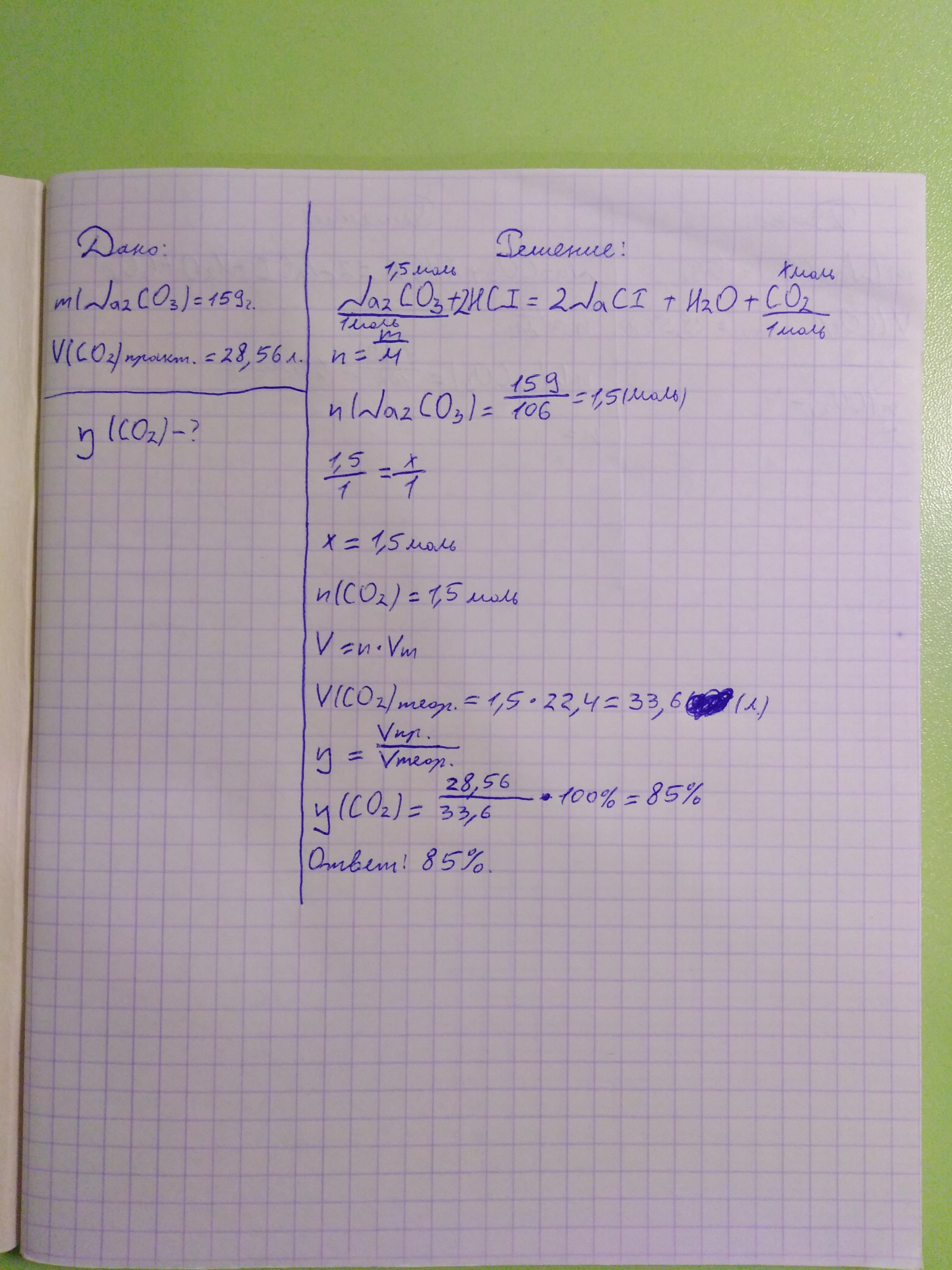 При взаимодействии 159г карбоната натрия (Na2CO3) и HCl получили практически 28.56л CO2. Определить выход продукта