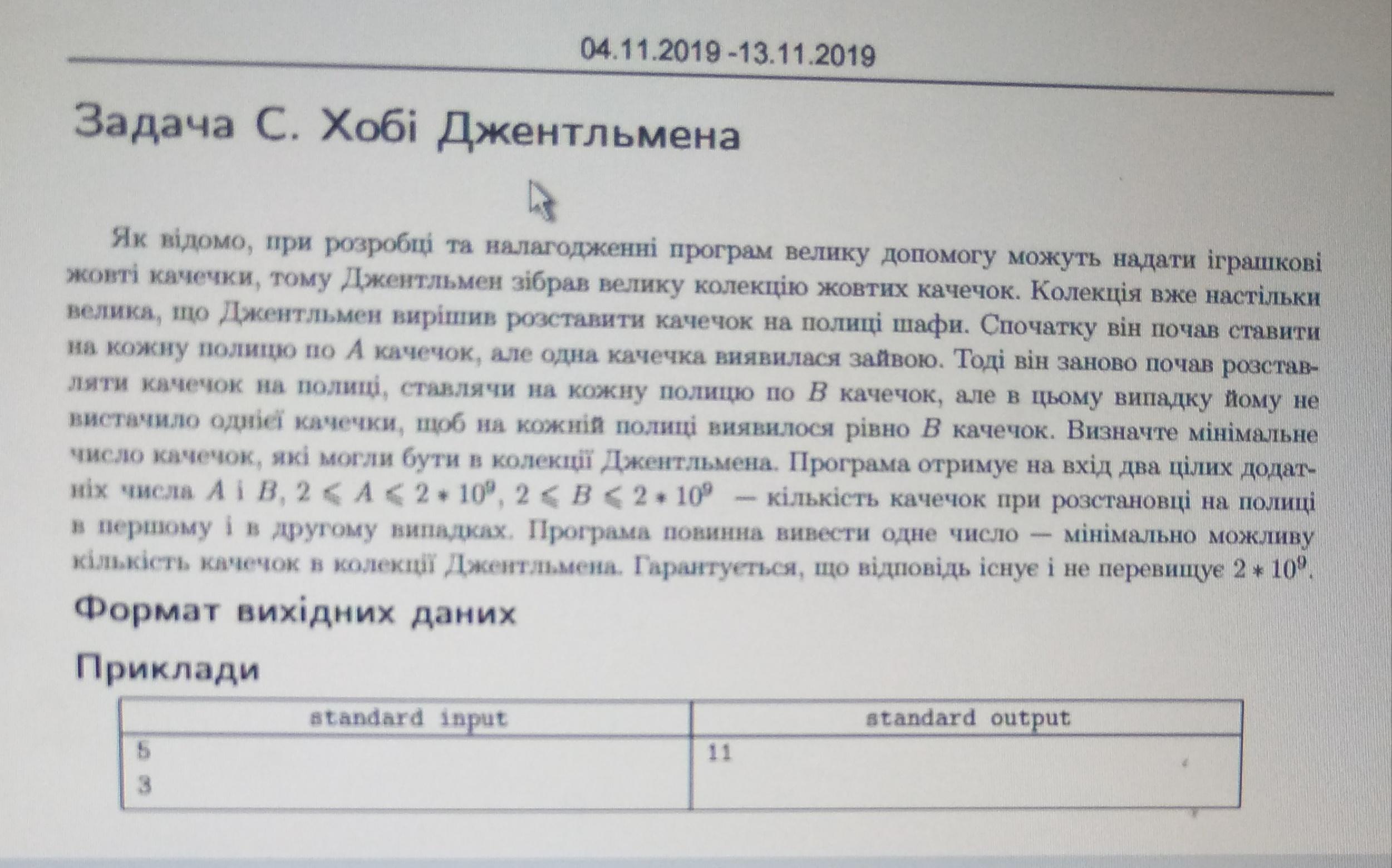 Когда джентельмен начал расставлять уточек на полки по А штук на полку, у него одна уточка оказалась лишней. После етого он начал расставлять уточек по В штук на полку, но тогда у него не хватало одной уточки. Узнайте минимальное количество уточек. Программа на входе получает числа А и В, а выводит число, обозначающее количество уточек.