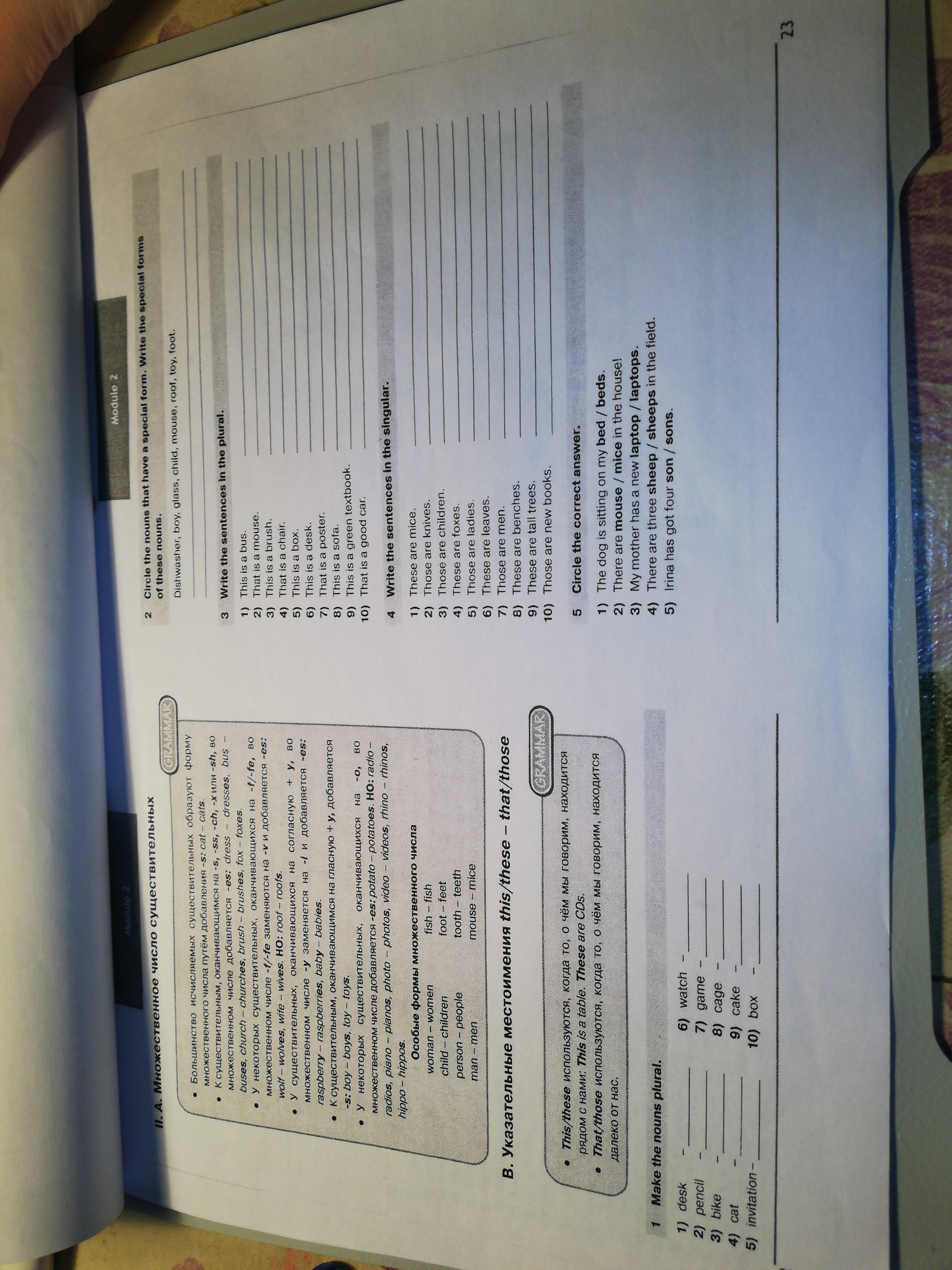 1. The dog is sitting on my bed. 2. There are mice in the house! 3. My mother has a new laptop. 4. There are three sheeps in the field. 5. Irina has got four sons.