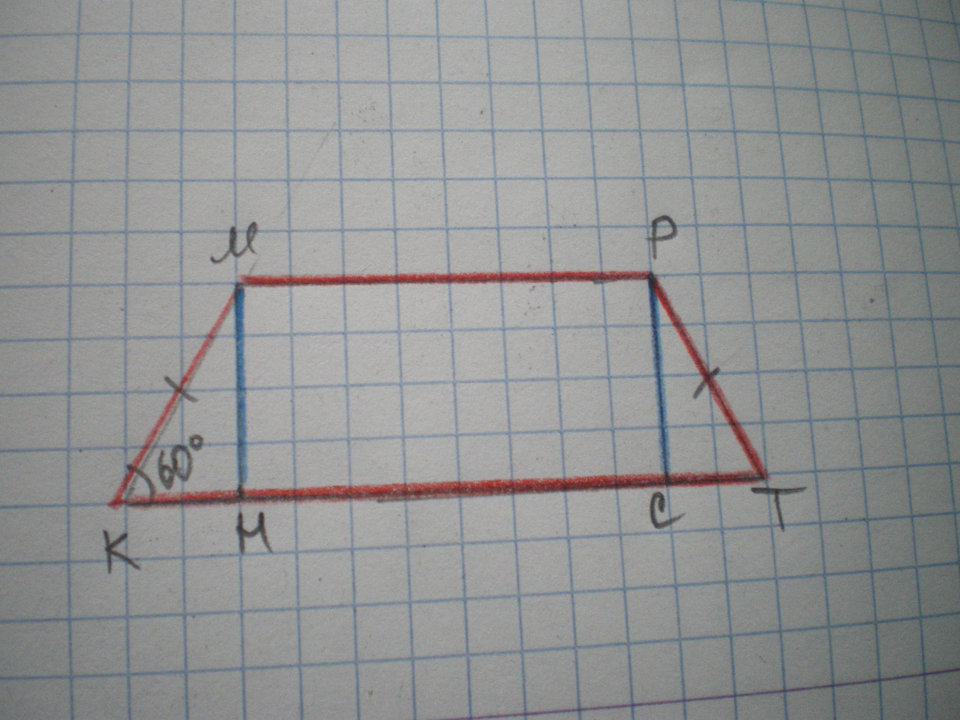 Дано: КМРТ - трапеція, КМ=РТ=4 см, КТ=12 см, ∠К=60°. Знайти МР.