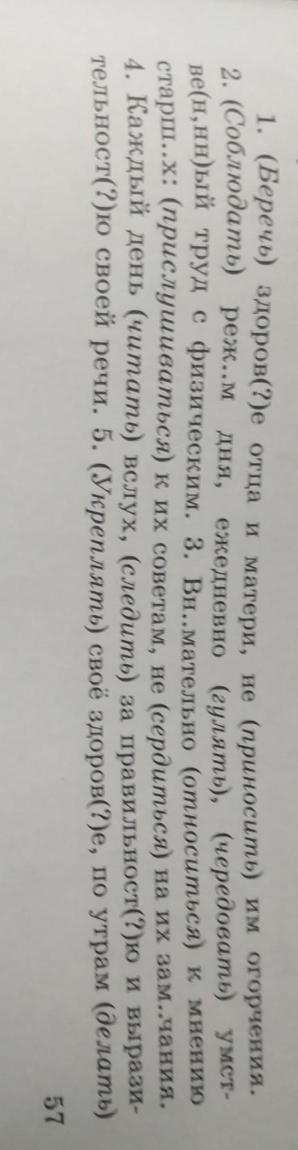5. (укреплять) своё здоровье, по утрам (делать) зарядку, (принимать) прохладный душ. 6. (Следить) за чистотой, (класть) на место свои вещи.