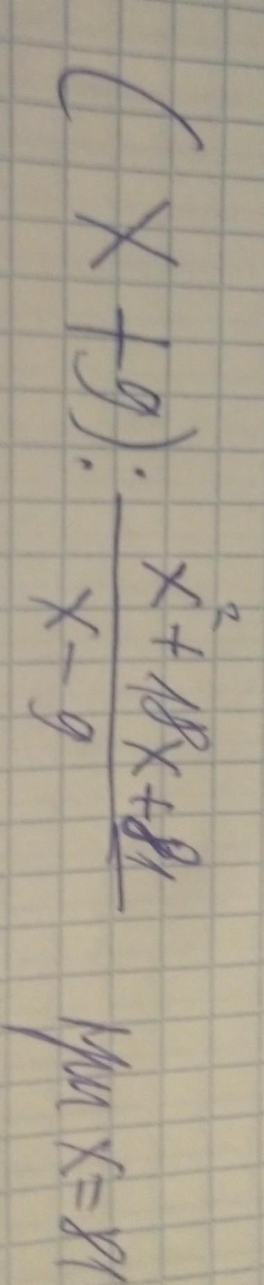 ( x+9)÷x²+18x+81/x-9 = (x+9)÷x² +18 +9 /x-1 = (x+9)÷x +18 +9/-1 =(x +9)÷-x -8-9 = x+9÷(-x)-8-9 = 9x÷(-x) -8-9 = 9x÷(-x)-17=9x ÷ -17x;
