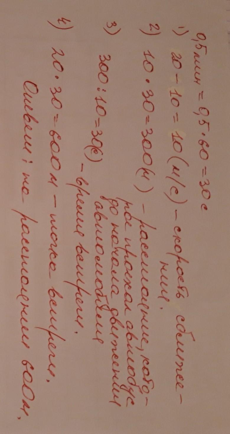 От автостанции с интервалом 0,5 мин. в одном направлении выехали автобус, а затем автомобиль, скорости которых соответственно 10 м/с и 20 м/с. На каком расстоянии от автостанции автомобиль догонит автобус