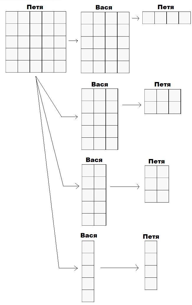 игрок отламывает от неё прямоугольный кусок и съедает его (в результате остаётся тоже прямоугольник, состоящий из клеток, но меньшего размера). Начинает игру Петя, далее ходят по очереди.