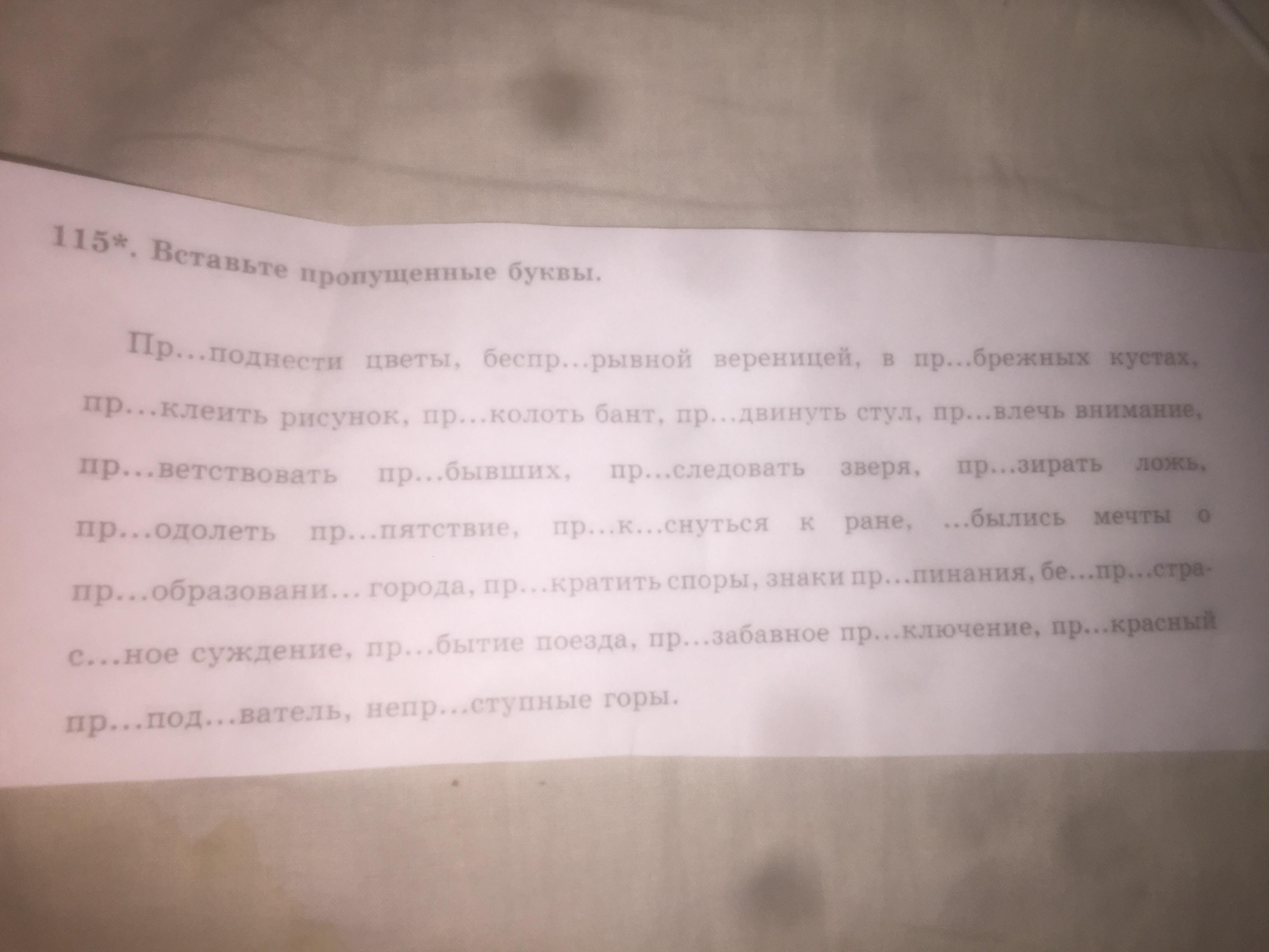 Преподнести цветы, беспрерывной вереницей, в прибрежных кустах, приклеить рисунок, приколоть бант, придвинуть стул, привлечь внимание, приветствовать прибывших, преследовать зверя, презирать ложь, преодолеть препятствие, прикоснуться к ране, сбылись мечты о преобразовании города, прекратить споры, знаки препинания, беспристрастное суждение, прибытие поезда, презабавное приключение, прекрасный преподаватель, неприступные горы.