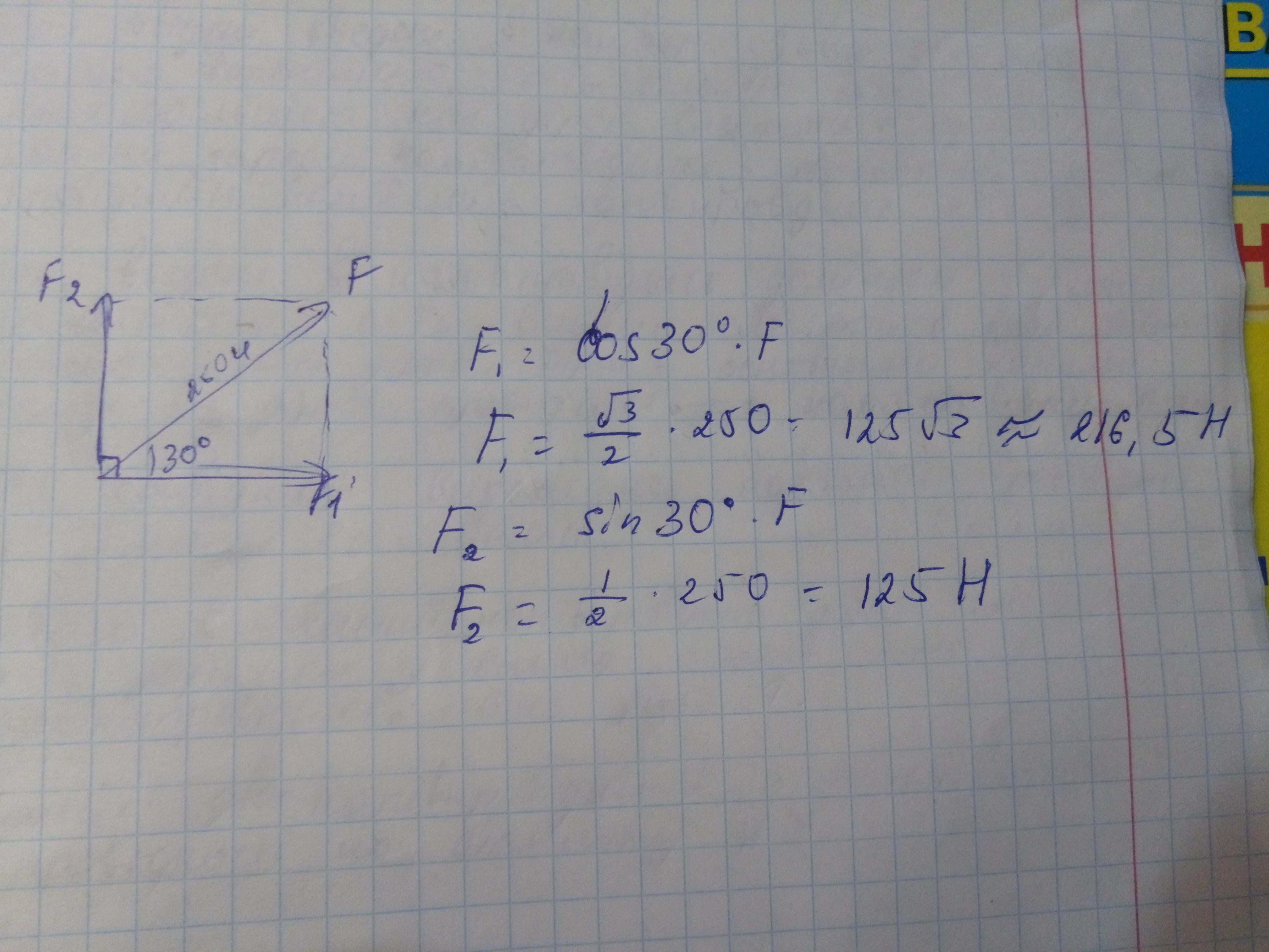 яке значення мають модулі сил, напрямлених перпендикулярно одна до одної, якщо їх можна замінити рівнодійною 250Н яка утворює кут 30^ з однією із цих сил?