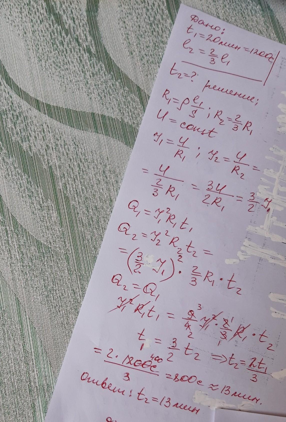 На плитку со спиралью поставили чайник, вода в нём закипела через 20 минут. После спираль перегорела, и тогда решили спираль укоротить на треть. Через какое время при равных условиях и укороченной спиралью закипит вода?