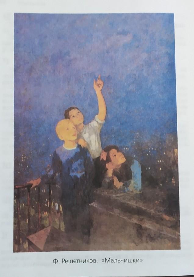 В этот прекрасный момент мальчишки совсем не видят и не замечают ничего вокруг. Их взгляд прикован только к звездному небу и прекрасной ночной синеве. Меня притягивают их глаза, которые наполнены какой-то непознанной тайной и ребяческим восторгом. Вокруг мальчишек раскинулся ночной город, который тихонько погрузился в теплые объятия летней ночи и сладко начал засыпать в прозрачной дымке. Город становится невидимым, полностью сливаясь с прекрасным ночным небом, а эта атмосфера еще больше манит маленьких мечтателей устремлять свои взгляды в таинственное небо, делясь с товарищами самыми сокровенными мыслями и мечтами.
