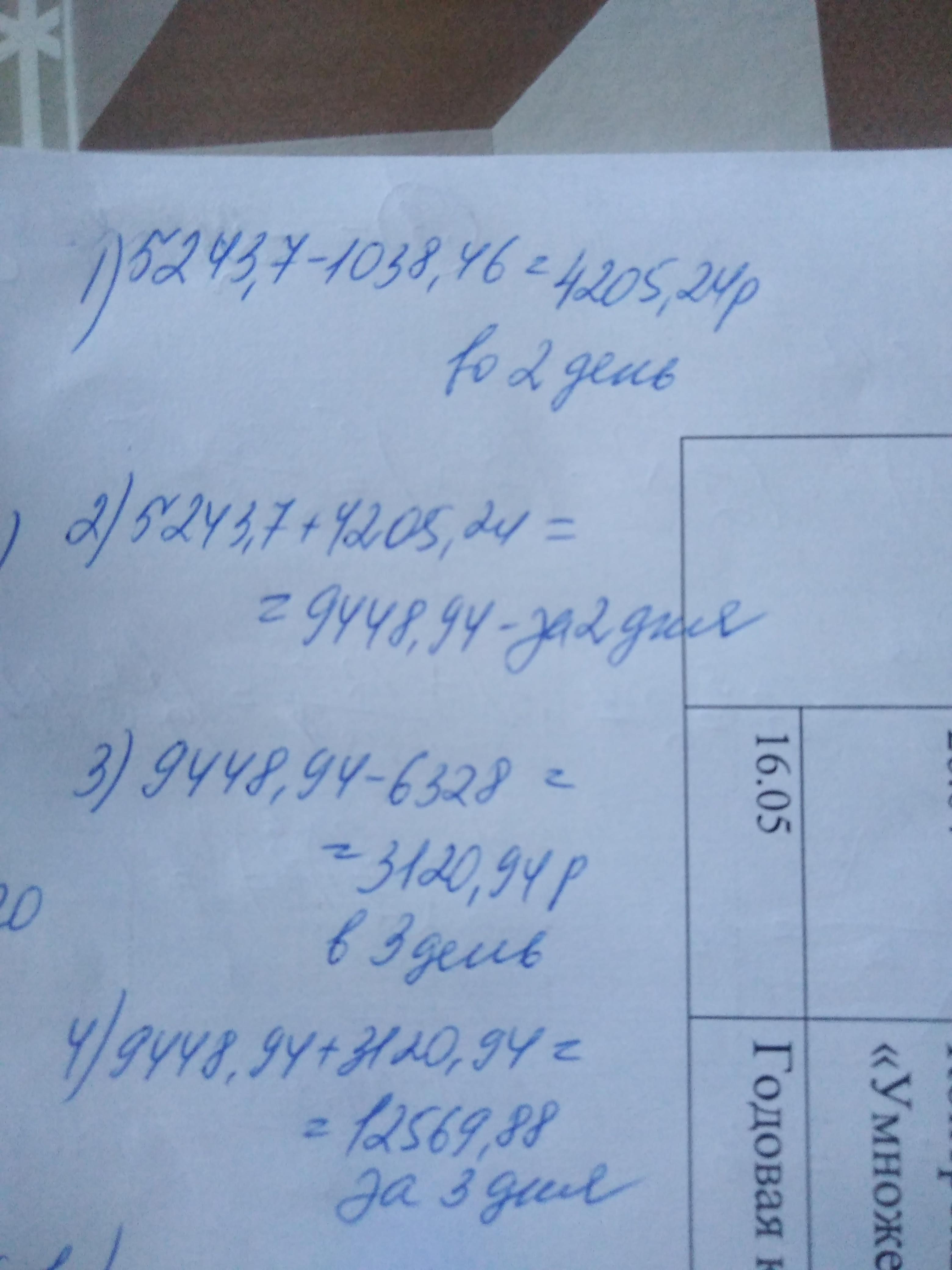 Выручка от продажи конфет в первый день составила 5243,7 р., во второй — на 1038,46 р. меньше, а в третий — на 6328 р. меньше, чем во второй и первый дни вместе. Какова выручка от продажи конфет за эти три дня?