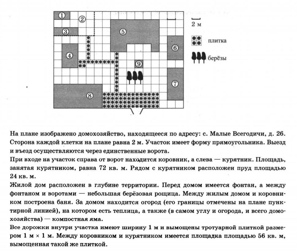 В условии (в тексте ) написано , что сторона каждой клетке равна 2 м . Сначала нахожу площадь жилого дома под цифрой 5 . Жилой дом имеет форму прямоугольника , значит, находим площадь по формуле прямоугольника .(произведение его смежных сторон ) . так как в условии сказано ,что сторона каждой клетки равна 2 м ,значит , 8*12= 96 кв.м . 96-12= 84 кв.м - площадь жилого дома . Находим площадь теплицы . Теплица тоже имеет форму прямоугольника : 2*6=12 кв.м .
