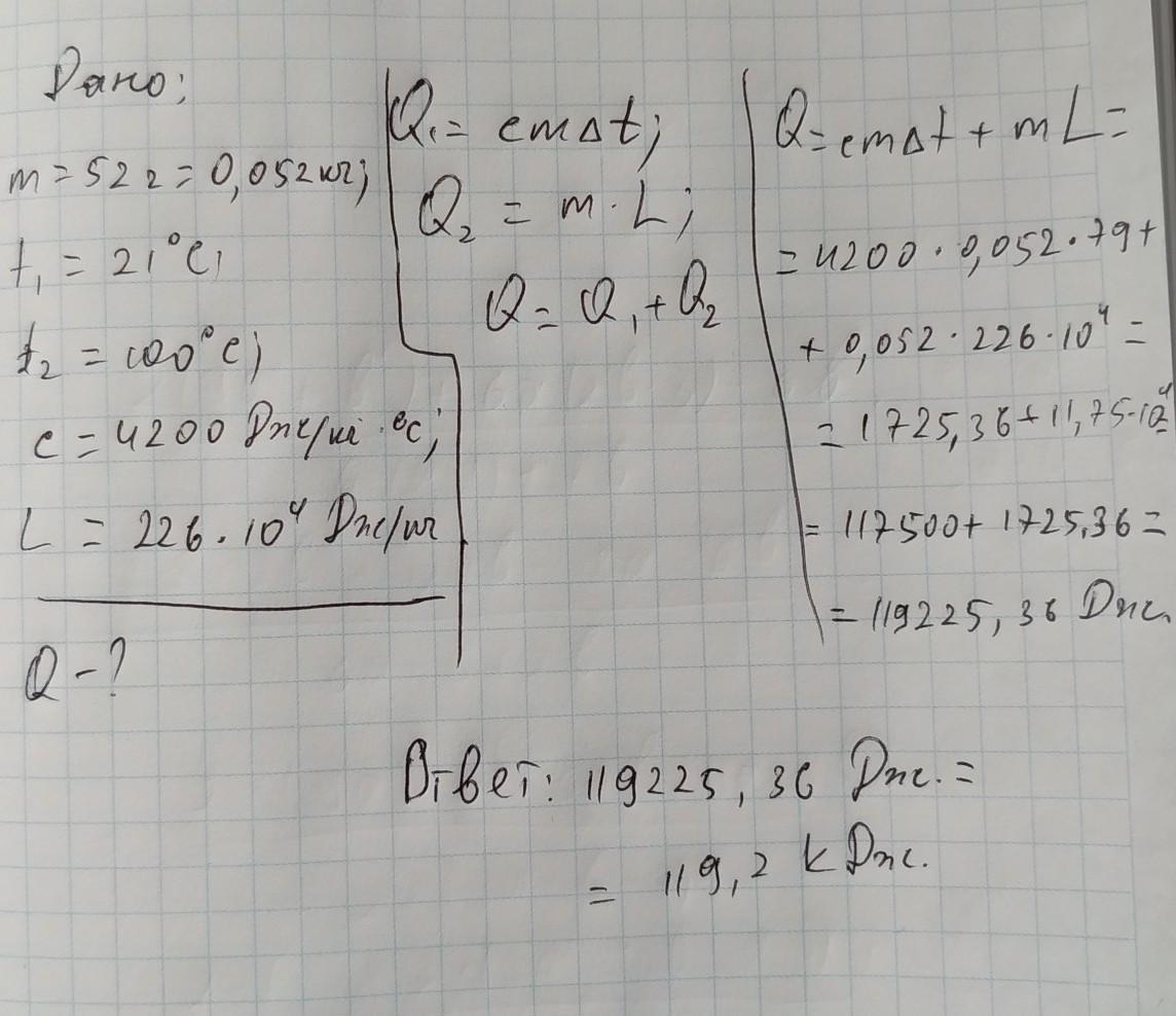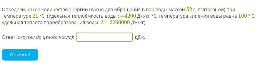 Определи, какое количество энергии нужно для обращения в пар воды массой 52 г, взятого(-ой) при температуре 21 °С. (Удельная теплоёмкость воды с=4200 Дж/кг·°С, температура кипения воды равна 100 ° С, удельная теплота парообразования воды L=2260000 Дж/кг).