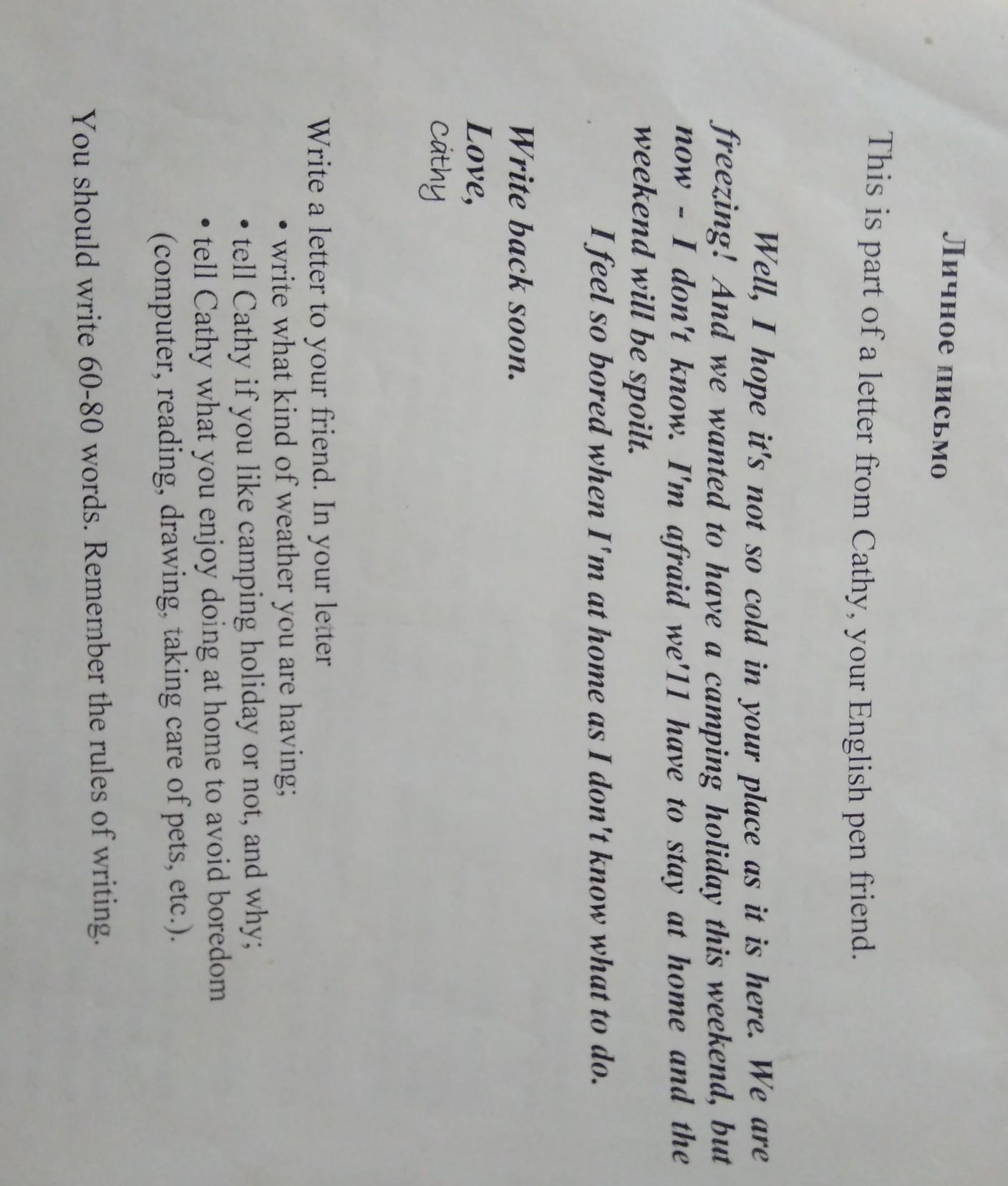In your last letter you asked me about the weather we have. Russian autumn is cool and windy. Sometimes it rains. Today it isn't raining but it's foggy. As you know, we're having holidays soon. I'd like to go camping with my brothers. If you want, you can join us. Sometimes I feel bored at home. So, I try to find an interesting book or film. Often I call my friends and invite them to my place.