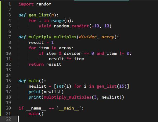 2. Создать список из 9 елементов, которые выбираються случайно из интервала(-10,10).Найти произведение(добуток) елементов кратных числу 3.