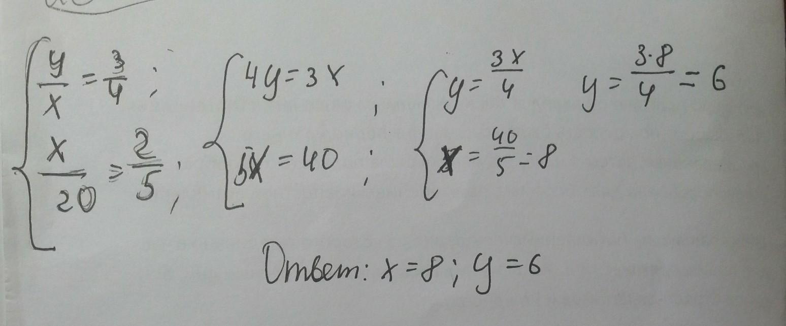 Нипишите вместо x и y такие числа, чтобы каждые из двух равенство был верными. y/x=3/4 и x/20=2/5