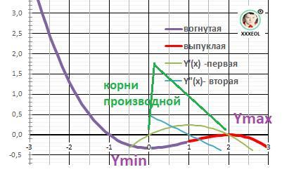 Там где у функции экстремумы - максимумы и минимумы, там у первой производной корни - нули.