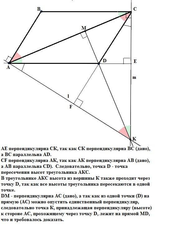 CF перпендикулярна AК, так как АК перпендикулярна АВ (дано), а АВ параллельна СD). Следовательно, точка D - точка пересечения высот треугольника АКС.