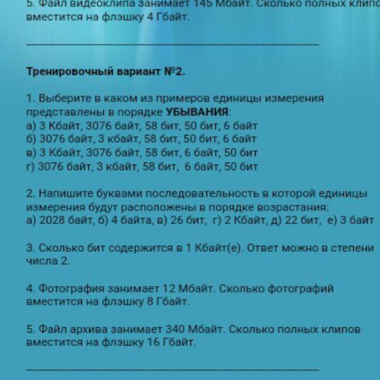 на рахунок другого ось:1.22 бит 2.26 бит 3.3 байта 4.4 байта 5.2 кбайт 6.2028 байт. якщо в останніх помилився вибачаюсь, це моя перша відповідь зовсім)