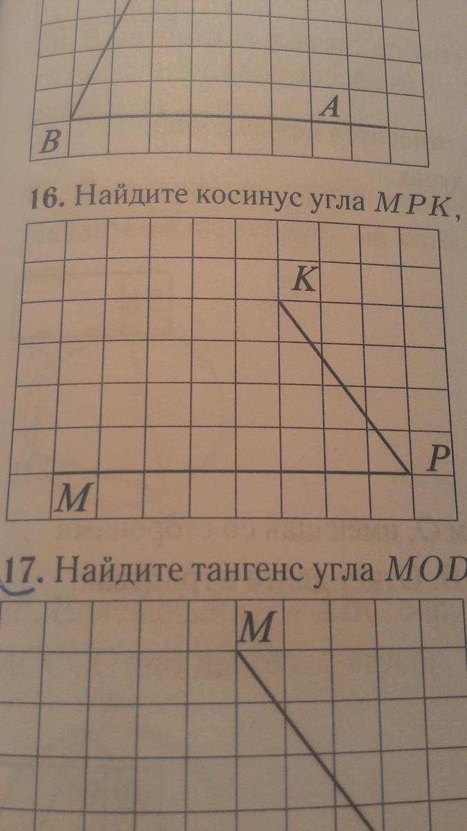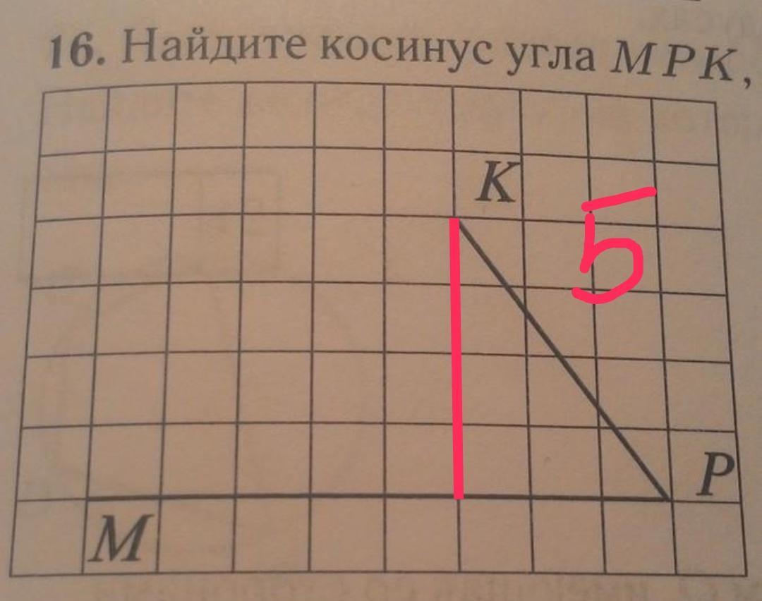 нужно построить прямоугольный треугольник (провести из К перпендикуляр к МР), вычислить КР (по т.Пифагора) и записать косинус угла по определению =