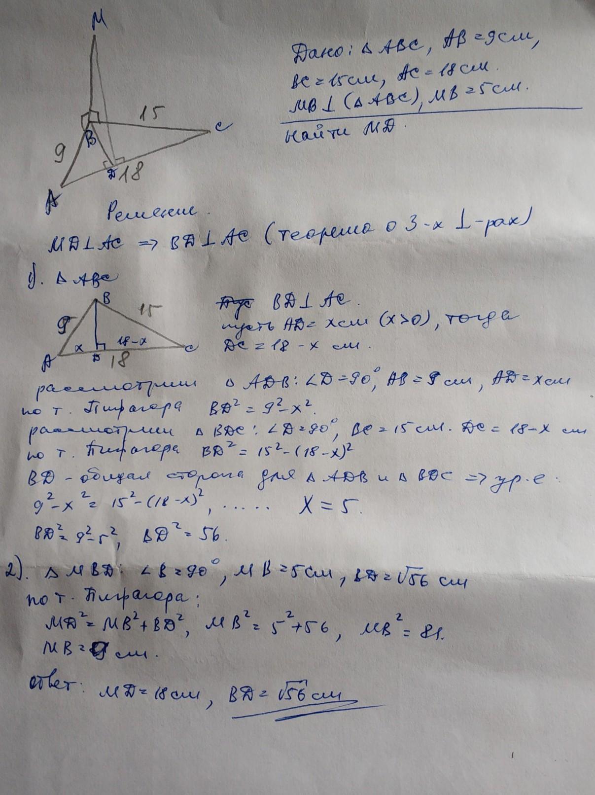 Из вершины большего угла плоскости треугольника проведен перпендикуляр равный 5 см. определить расстояние от концов перпендикуляра до противолежащей стороны треуголника если стороны треугольника равны 9,15,18 см. Даю 45 балоов