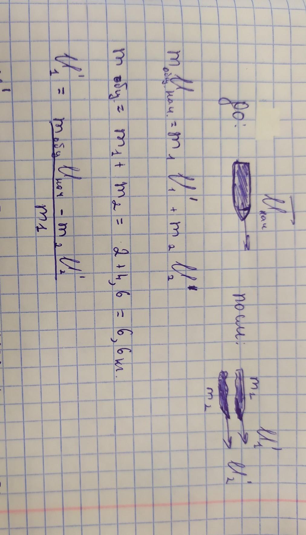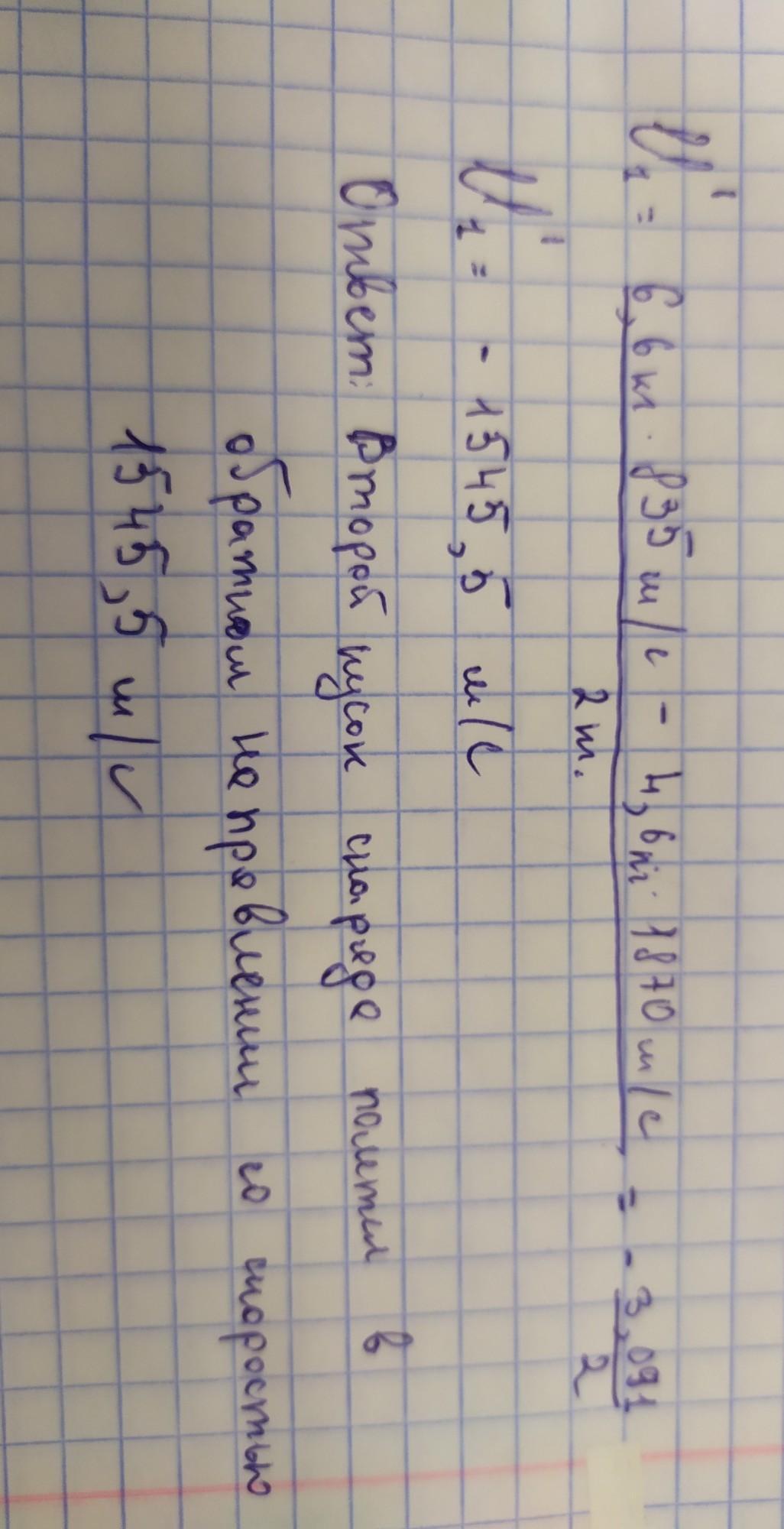 Снаряд, летевший горизонтально со скоростью 835 м/с, разорвался на две части массами 2 кг и 4,6 кг. Скорость большего осколка осталась горизонтальной и равной 1870 м/с. Определи скорость меньшего осколка.