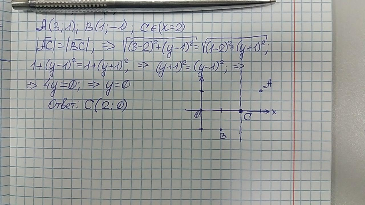 Так как известна абсцисса точки С и АС=ВС, то, используя формулу длины вектора, можно приравнять АС и ВС, после чего вычислить ординату точки С.