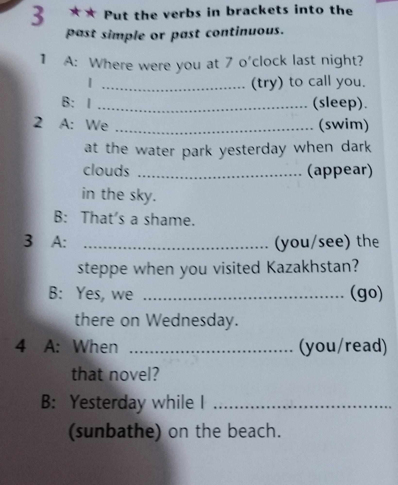 1 tried … was sleeping 2 were swimming … appeared 3 Did you see … went 4 did you read … was sunbathing