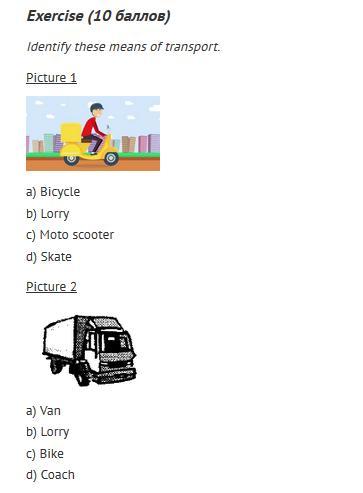 Ответ: картинка первая - Moto scooter(скутер), картинка вторая - Lorry(грузовик)