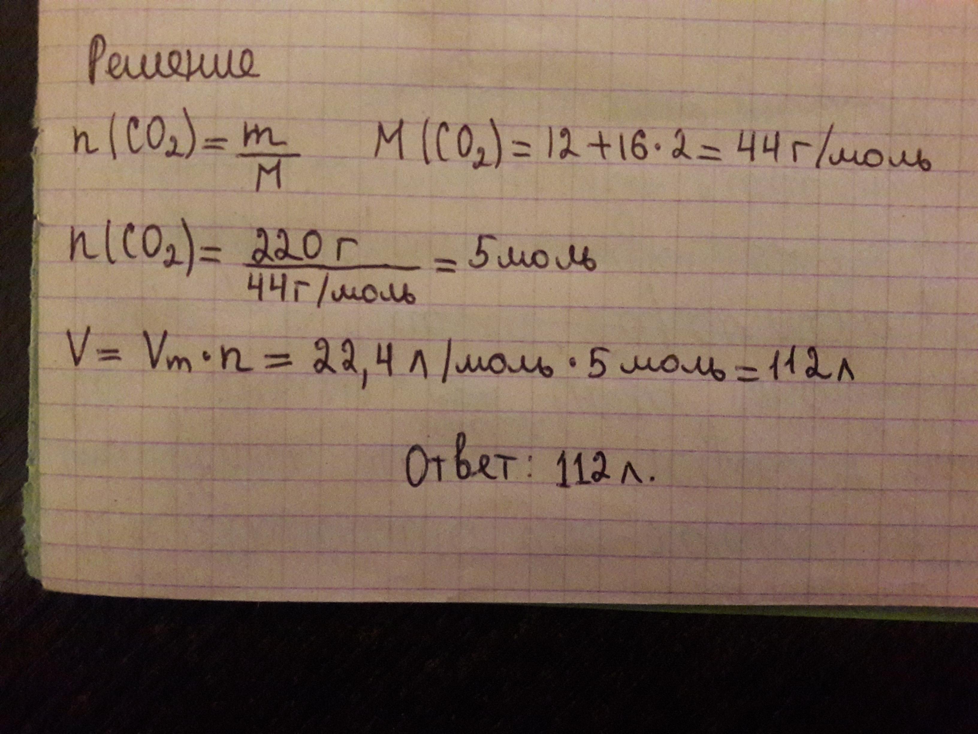 рассчитайте объем углекислого газа CO2,если его масса 220г (желательно сделать на листочке и сфоткать) пожалуйста