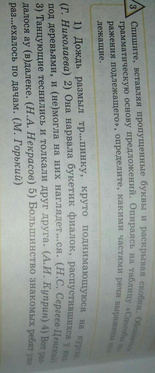1) Дождь(подлежащее-сущ) размыл(сказуемое) тропинку, круто поднимающуюся на курган. 2) Она(подлежащее-местоимение) нарвала(сказуемое) букетик фиалок, распустившихся у них под деревьями, и не могла(сказуемое) на них наглядеться(сказуемое). 3) Танцующие(подлежащее-причастие) теснились(сказуемое) и толкали(сказуемое) друг друга. 4) Вот раздалося(сказуемое) ау(подлежащее-междометие) вдалеке. 5) Большинство(подлежащее-сущ) знакомых ребят(вторая часть подлежащего-сущ. из словосочетания) уже разъехалось(сказуемое) по дачам.