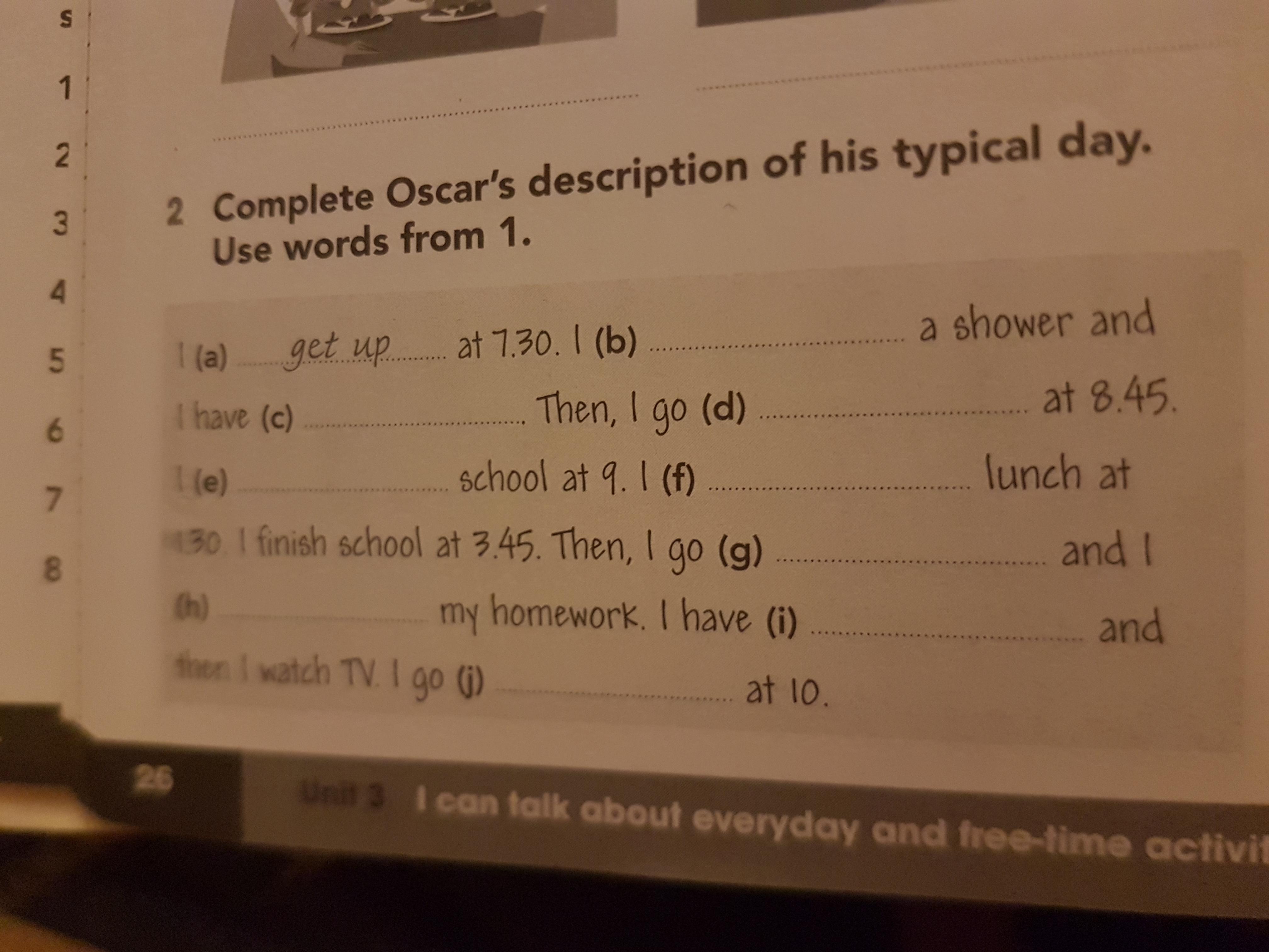 I have a shower and I have breakfast Then I go to shool I srart shool at 09:00 I have a lucnh at(время) I finish shool at 3:45 Then I go to(написать куда вы ходите спорт или что то другое) and I do My homework I have это я не знаю and then I watch Tv I go to bed at 10:00