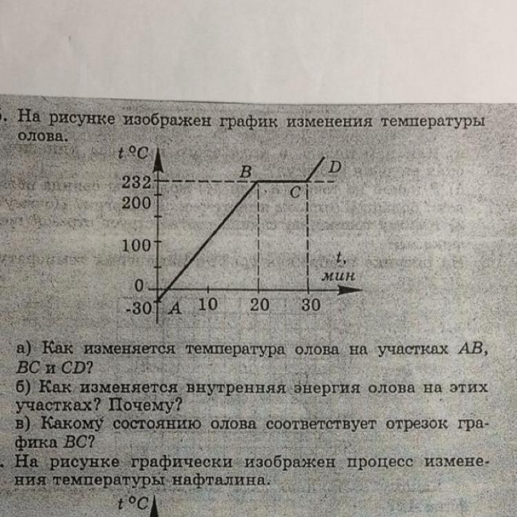 Ответ:а) на участке АБ температура увеличивалась, на БС оставалась неизменной, а на СД опять увеличивалась.б) Внутренняя энергия увеличивается, т. К. температура увеличивается. с) плавление.