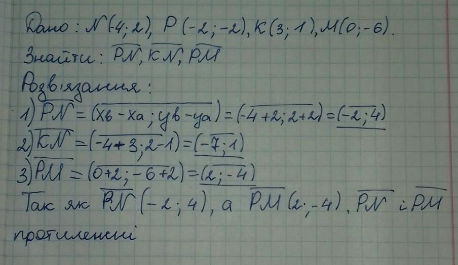Дано точки N(-4;2), P(-2;-2), К(3;1), М(0;-6).Знайдыть координати веткторыв РN, KN, PM. Визначте чи є серед цих векторів протилежні. Якщо так, укажіть, які саме.