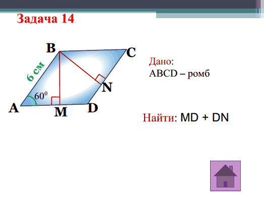 Значит, каждая сторона этого ромба равна 6. На рисунке изображено, что биссектриса угла B перпендикулярна сторонам AD и DС, а следовательно делит эти две стороны пополам. 6:2 = 3 (MD или DN)