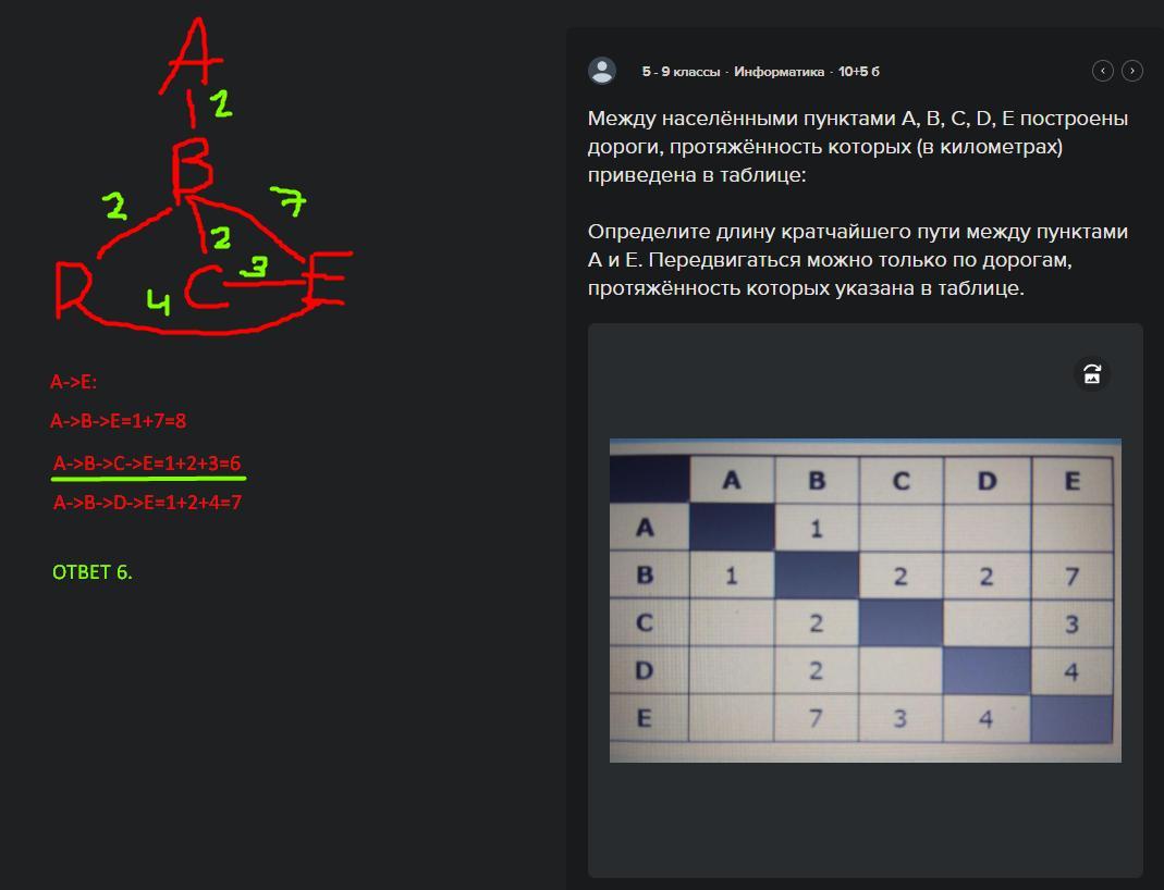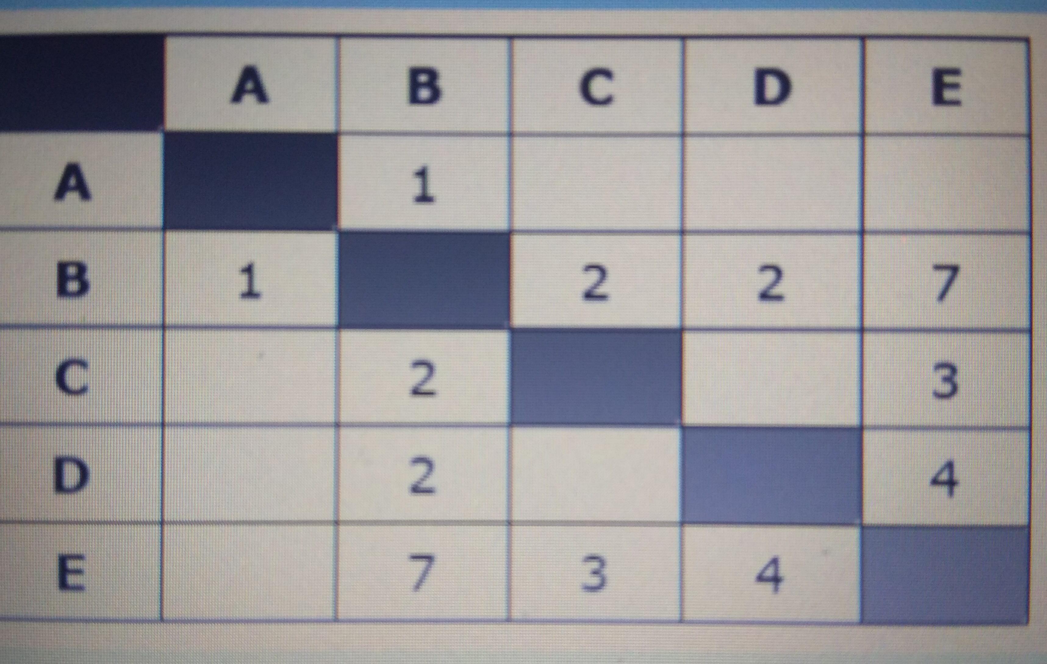 Определите длину кратчайшего пути между пунктами А и E. Передвигаться можно только по дорогам, протяжённость которых указана в таблице.