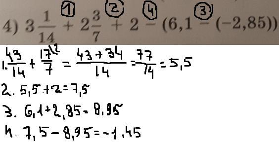 2) (3*8+5)/8 -4,42 + 5 -6,33 = 3,625 -4,42 + 5 - 6,33 = (3,625+5)+(-4,42-6,33) = 8,625 + (-10,75) = 8,625 - 10,75 = - (10,750 - 8,625) = -2,125