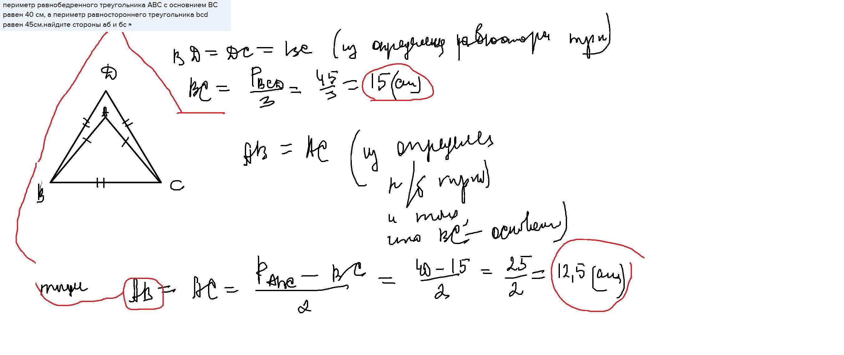 периметр равнобедренного треугольника ABC с основанием BC равен 40 см, а периметр равностороннего треугольника bcd равен 45см.найдите стороны аб и бс.