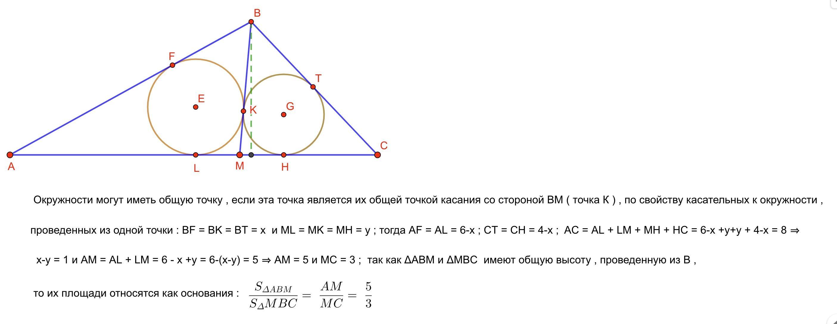 В треугольнике ABC со сторонами AB = 6, BC = 4, AC = 8 на стороне AC отмечена такая точка M, что вписанные окружности треугольников ABM и BCM имеют общую точку. Найдите отношение площадей этих треугольников.