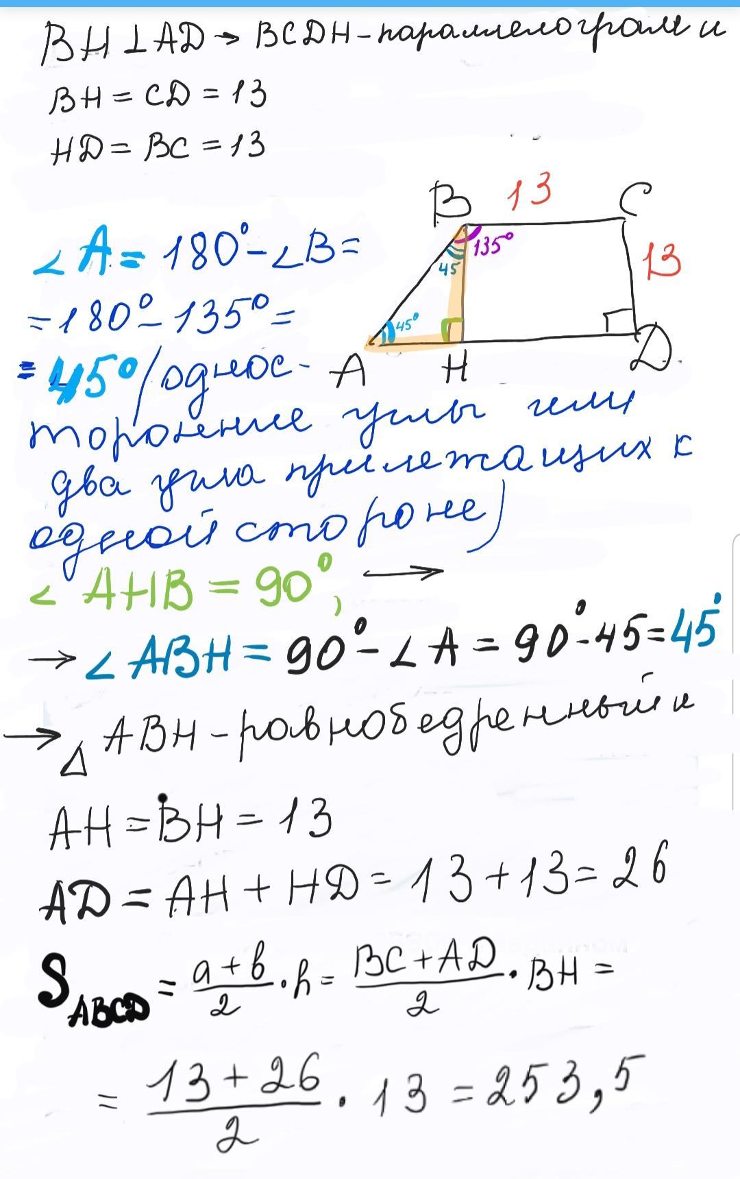 Дано: трапеция ABCD CD=CB=13; угол D=90; угол B=135;