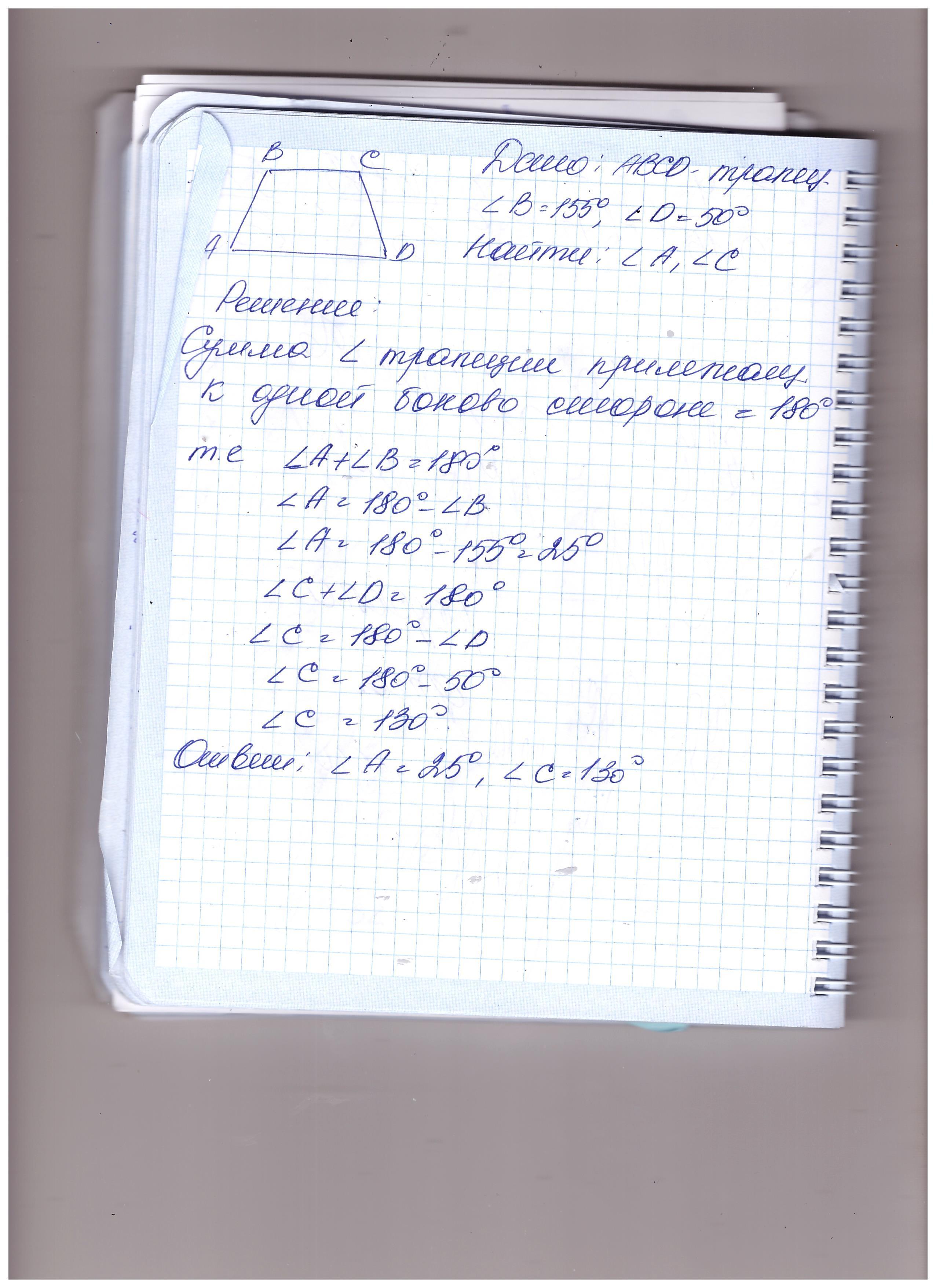 1)трапеция найти углы A и C угол B 155 градусов угол D 50 градусов 2)трапеция найти угол с и угол С:угол D=4:1 3)трапеция найти угол aob
