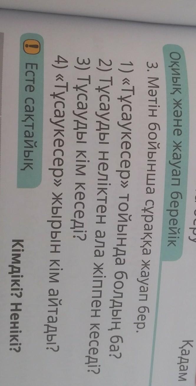 4. Тұсаукесер жырын көбіне апаларымыз, жеңгелеріміз айтады. Тұсауын кесейін деп жатқан адам барлығы қосылып айтады.