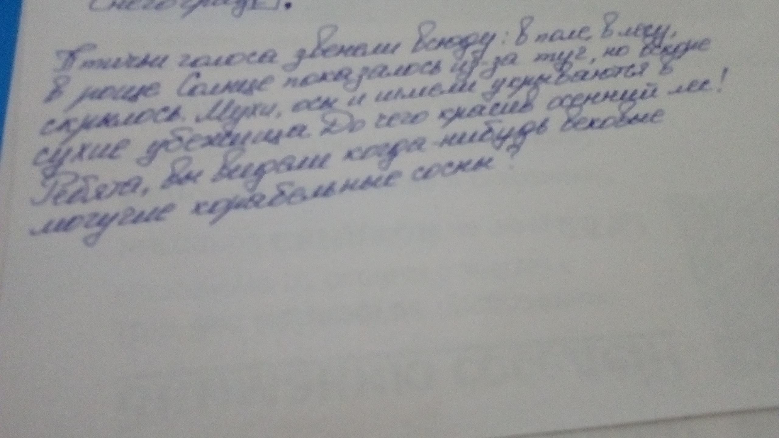 Ответ:Птичьи голоса звенели всюду:в поле,в лесу,в роще.Солнце показалось из-за туч,но вскоре скрылась.Мухи,осы, и шмели укрываются в сухие убежища.До чего красив осенний лес.Ребята вы видели когда-нибудь вековые могучие корабельные сосны?